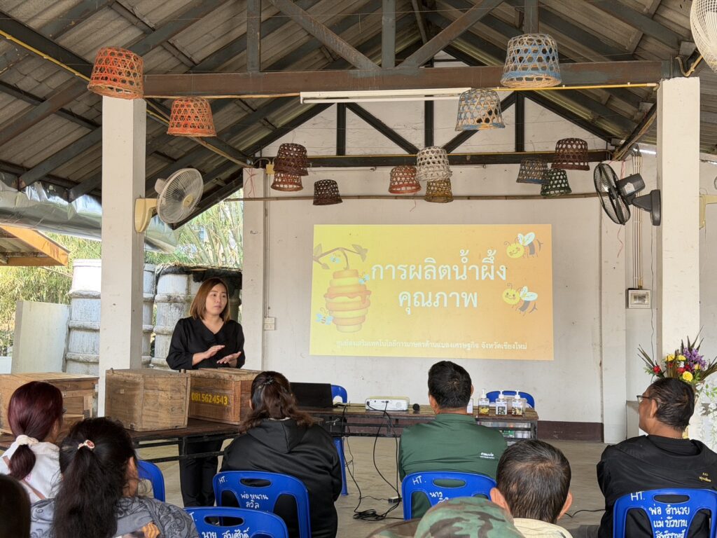 วันที่ 13 ม.ค. 2569 นายธราทิพย์ ปาวะระ ผู้อำนวยการศูนย์ส่งเสริมเทคโนโลยีการเกษตรด้านแมลงเศรษฐกิจ จ.เชียงใหม่ มอบหมายให้ นางกิ่งกาญจน์ ชัยการ นักวิชาการส่งเสริมการเกษตรชำนาญการ และทีมเจ้าหน้าที่นักวิชาการศูนย์ฯ ถ่ายทอดองค์ความรู้ การเลี้ยงผึ้งโพรง ให้กับเกษตรกรศูนย์ศึกษาพัฒนาการท่องเที่ยวโดยชุมชน ณ ศาลาเอนกประสงค์บ้านหัวทุ่ง ตำบลเชียงดาว อำเภอเชียงดาว จังหวัดเชียงใหม่ ภายใต้โครงการส่งเสริมงานอาชีพการเลี้ยงผึ้งโก๋น สร้างสมดุลสิ่งแวดล้อมในกลุ่มแรงงานนอกระบบ เพื่อส่งเสริมอาชีพและการพึ่งพาตนเองได้อย่างมีคุณภาพ โดยมีกิจกรรมที่น่าสนใจได้แก่ การเลี้ยงผึ้งโพรง การเก็บน้ำผึ้งอย่างมีคุณภาพ เทคนิคและวิธีการเลี้ยงผึ้งโพรง เป็นต้น