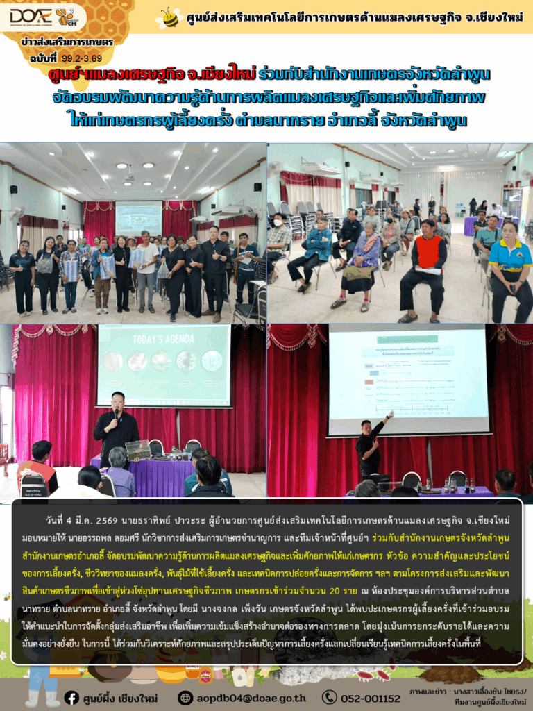 วันที่ 4 มี.ค. 2569 นายธราทิพย์ ปาวะระ ผู้อำนวยการศูนย์ส่งเสริมเทคโนโลยีการเกษตรด้านแมลงเศรษฐกิจ จ.เชียงใหม่ มอบหมายให้ นายอรรถพล ลอมศรี นักวิชาการส่งเสริมการเกษตรชำนาญการ และทีมเจ้าหน้าที่ศูนย์ฯ ร่วมกับสำนักงานเกษตรจังหวัดลำพูน สำนักงานเกษตรอำเภอลี้ จัดอบรมพัฒนาความรู้ด้านการผลิตแมลงเศรษฐกิจและเพิ่มศักยภาพให้แก่เกษตรกร หัวข้อ ความสำคัญและประโยชน์ของการเลี้ยงครั่ง, ชีววิทยาของแมลงครั่ง, พันธุ์ไม้ที่ใช้เลี้ยงครั่ง และเทคนิคการปล่อยครั่งและการจัดการ ฯลฯ ตามโครงการส่งเสริมและพัฒนาสินค้าเกษตรชีวภาพเพื่อเข้าสู่ห่วงโซ่อุปทานเศรษฐกิจชีวภาพ เกษตรกรเข้าร่วมจำนวน 20 ราย ณ ห้องประชุมองค์การบริหารส่วนตำบลนาทราย ตำบลนาทราย อำเภอลี้ จังหวัดลำพูน โดยมี นางจงกล เพ็งวัน เกษตรจังหวัดลำพูน ได้พบปะเกษตรกรผู้เลี้ยงครั่งที่เข้าร่วมอบรม ให้คำแนะนำในการจัดตั้งกลุ่มส่งเสริมอาชีพ เพื่อเพิ่มความเข้มแข็งสร้างอำนาจต่อรองทางการตลาด โดยมุ่งเน้นการยกระดับรายได้และความมั่นคงอย่างยั่งยืน ในการนี้ ได้ร่วมกันวิเคราะห์ศักยภาพและสรุปประเด็นปัญหาการเลี้ยงครั่งแลกเปลี่ยนเรียนรู้เทคนิคการเลี้ยงครั่งในพื้นที่