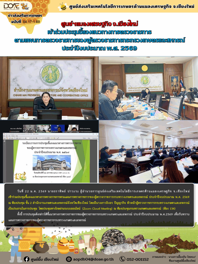 ข่าวประชาสัมพันธ์ศูนย์ฯ แมลงเศรษฐกิจ จ.เชียงใหม่ เข้าร่วมประชุมขับเคลื่อนการดำเนินงานศูนย์ปฏิบัติการ ในสังกัดสำนักงานส่งเสริมและพัฒนาการเกษตรที่ 6 จังหวัดเชียงใหม่ ครั้งที่ 1/2569 ผ่านระบบออนไลน์ aopdb04 / 30 มกราคม 2026 วันที่ 30 ม.ค. 2569