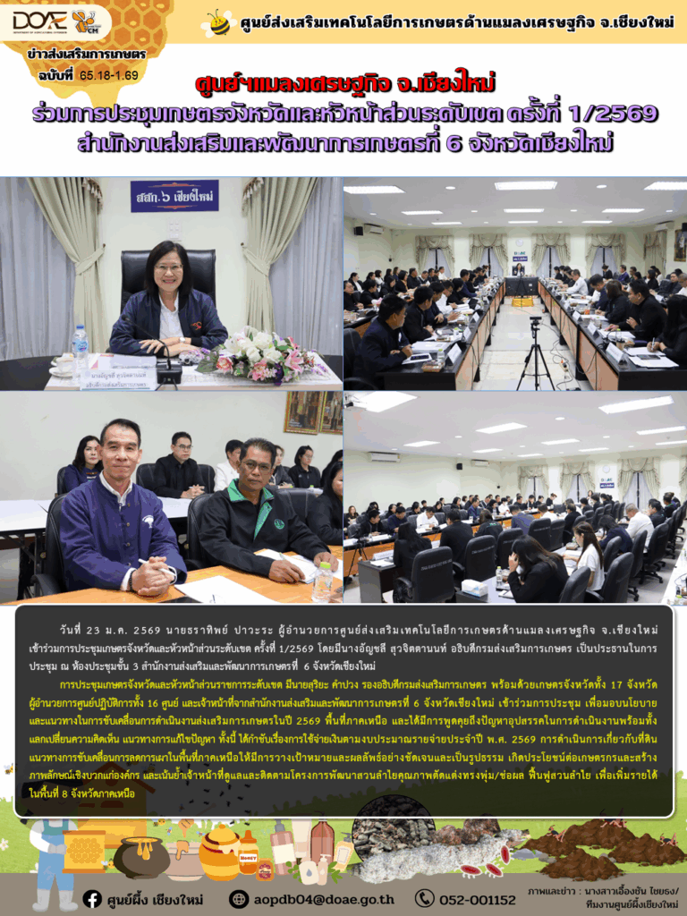ข่าวประชาสัมพันธ์ศูนย์ฯแมลงเศรษฐกิจ จ.เชียงใหม่ ร่วมการประชุมเกษตรจังหวัดและหัวหน้าส่วนระดับเขต ครั้งที่ 1/2569 สำนักงานส่งเสริมและพัฒนาการเกษตรที่ 6 จังหวัดเชียงใหม่ aopdb04 / 23 มกราคม 2026 วันที่ 23 ม.ค. 2569