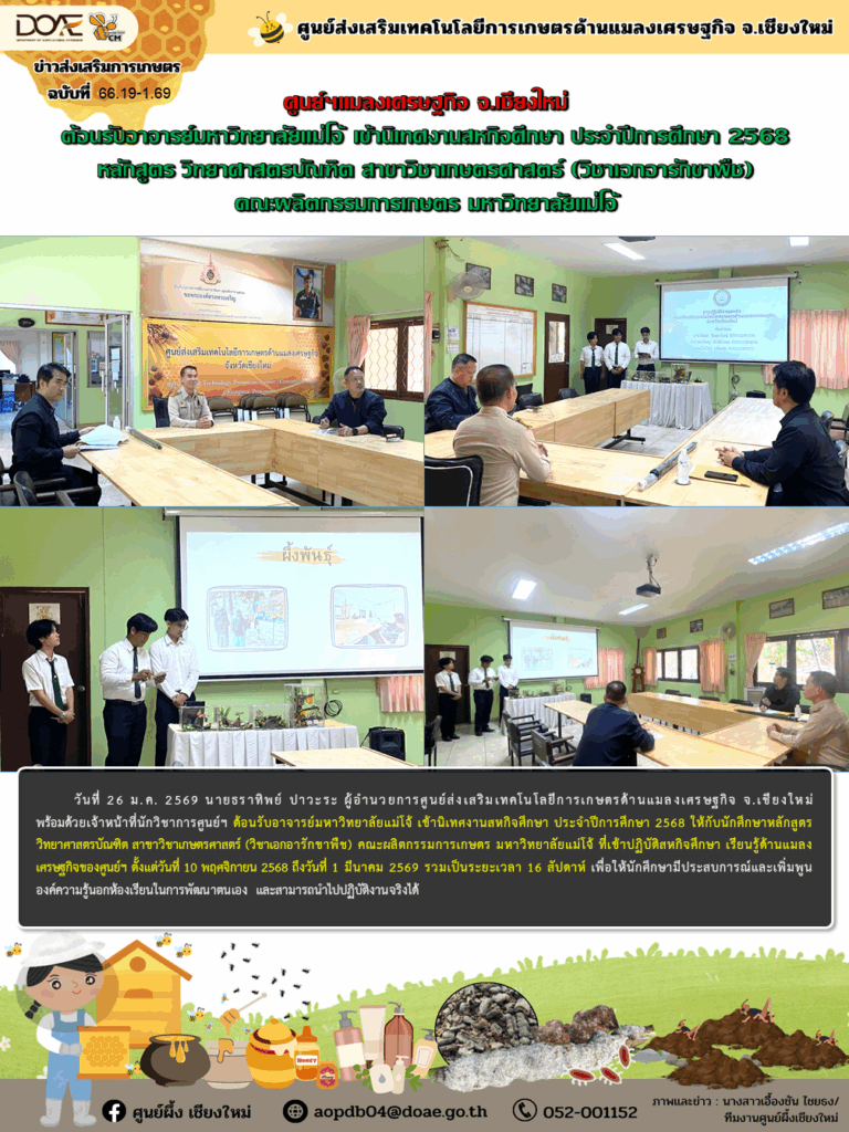 ข่าวประชาสัมพันธ์ศูนย์ฯแมลงเศรษฐกิจ จ.เชียงใหม่ ต้อนรับอาจารย์มหาวิทยาลัยแม่โจ้ เข้านิเทศงานสหกิจศึกษา ประจำปีการศึกษา 2568 หลักสูตร วิทยาศาสตรบัณฑิต สาขาวิชาเกษตรศาสตร์ (วิชาเอกอารักขาพืช) คณะผลิตกรรมการเกษตร มหาวิทยาลัยแม่โจ้ aopdb04 / 26 มกราคม 2026 วันที่ 26 ม.ค. 2569