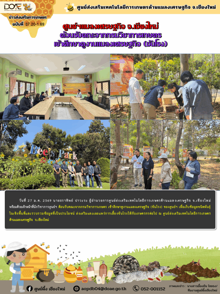 ข่าวประชาสัมพันธ์ศูนย์ฯแมลงเศรษฐกิจ จ.เชียงใหม่ ต้อนรับคณะจากกรมวิชาการเกษตร เข้าศึกษาดูงานแมลงเศรษฐกิจ (ชันโรง) aopdb04 / 27 มกราคม 2026 วันที่ 27 ม.ค. 2569