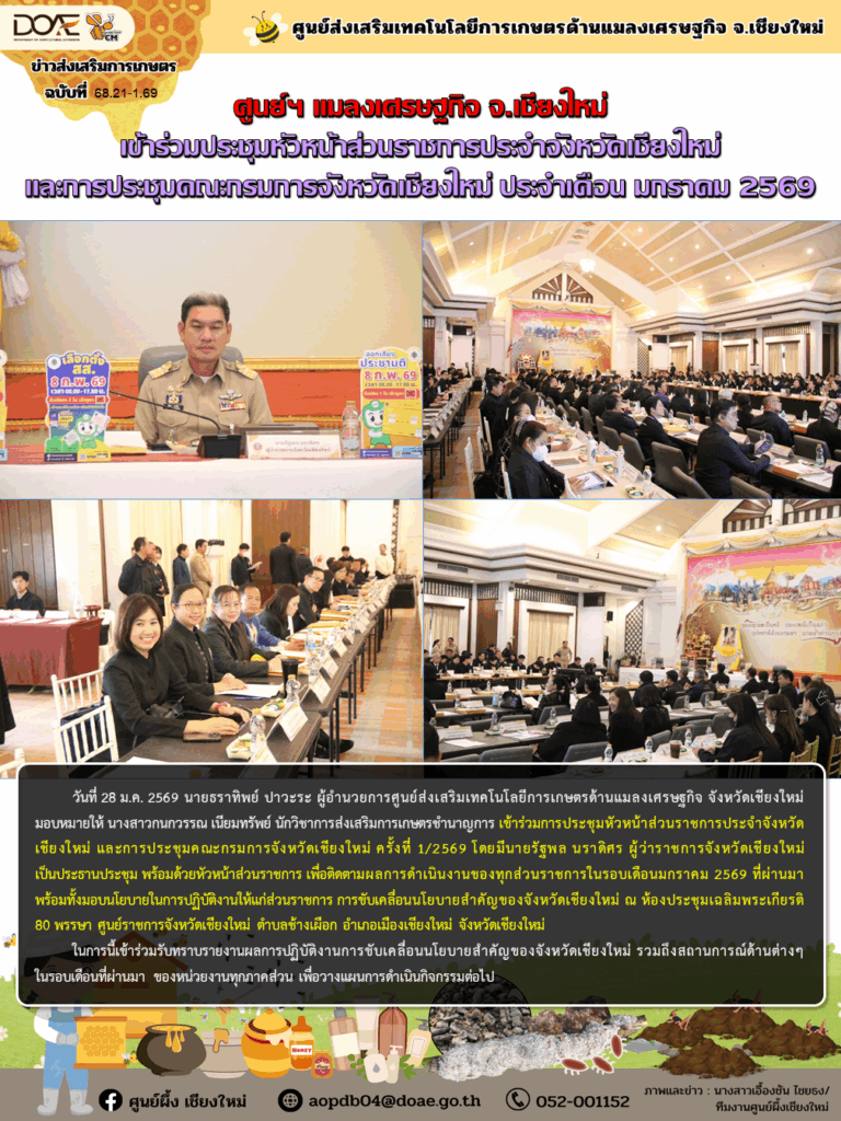 ข่าวประชาสัมพันธ์ศูนย์ฯ แมลงเศรษฐกิจ จ.เชียงใหม่ เข้าร่วมประชุมหัวหน้าส่วนราชการประจำจังหวัดเชียงใหม่ และการประชุมคณะกรมการจังหวัดเชียงใหม่ ประจำเดือน มกราคม 2569 aopdb04 / 28 มกราคม 2026 วันที่ 28 ม.ค. 2569