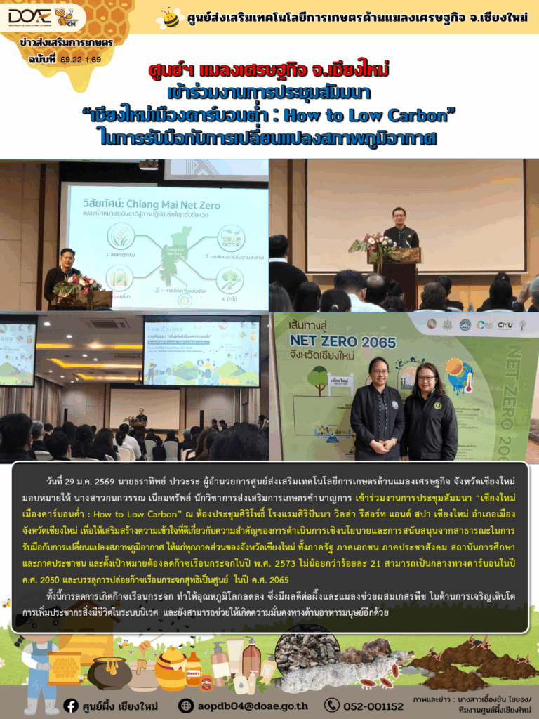 ข่าวประชาสัมพันธ์ศูนย์ฯ แมลงเศรษฐกิจ จ.เชียงใหม่ เข้าร่วมงานการประชุมสัมมนา “เชียงใหม่เมืองคาร์บอนต่ำ : How to Low Carbon” ในการรับมือกับการเปลี่ยนแปลงสภาพภูมิอากาศ aopdb04 / 29 มกราคม 2026 วันที่ 29 ม.ค. 2569