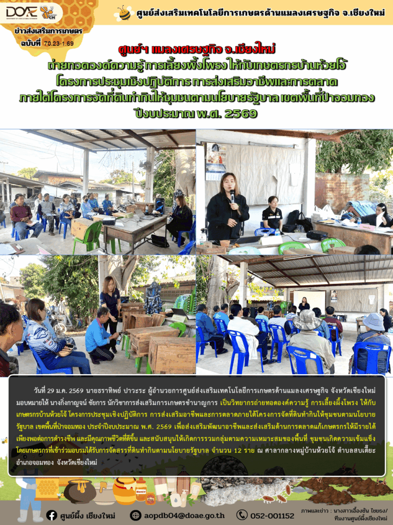 ข่าวประชาสัมพันธ์ศูนย์ฯ แมลงเศรษฐกิจ จ.เชียงใหม่ ถ่ายทอดองค์ความรู้ การเลี้ยงผึ้งโพรง ให้กับเกษตรกรบ้านห้วยโจ้ โครงการประชุมเชิงปฏิบัติการ การส่งเสริมอาชีพและการตลาด ภายใต้โครงการจัดที่ดินทำกินให้ชุมชนตามนโยบายรัฐบาล เขตพื้นที่ป่าจอมทอง ปีงบประมาณ พ.ศ. 2569 aopdb04 / 30 มกราคม 2026 วันที่ 29 ม.ค. 2569