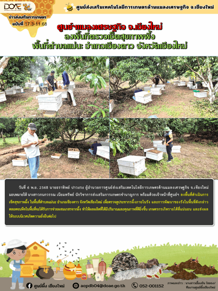 ข่าวประชาสัมพันธ์ศูนย์ฯแมลงเศรษฐกิจ จ.เชียงใหม่ ลงพื้นที่ตรวจเช็คสุขภาพผึ้ง พื้นที่ตำบลแม่นะ อำเภอเชียงดาว จังหวัดเชียงใหม่ aopdb04 / 11 พฤศจิกายน 2025 วันที่ 6 พ.ย. 2568 น