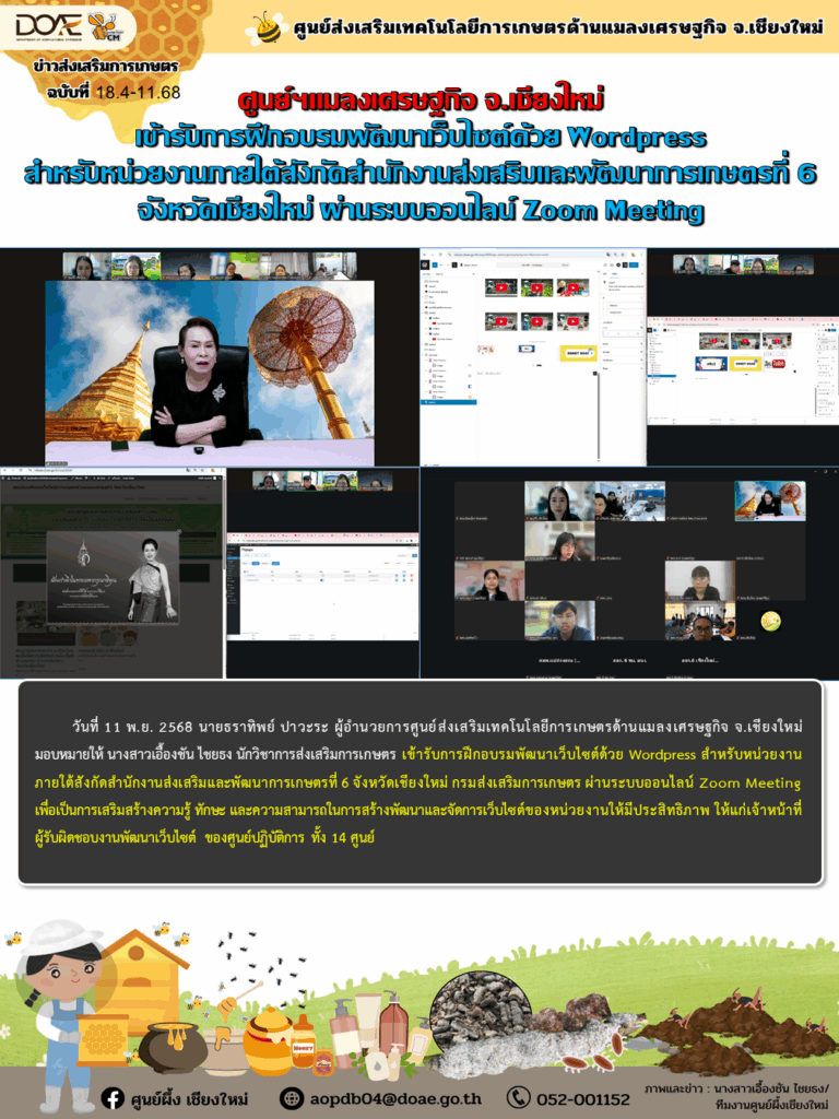 ข่าวประชาสัมพันธ์ศูนย์ฯแมลงเศรษฐกิจ จ.เชียงใหม่ เข้ารับการฝึกอบรมพัฒนาเว็บไซต์ด้วย WordPress สำหรับหน่วยงานภายใต้สังกัดสำนักงานส่งเสริมและพัฒนาการเกษตรที่ 6 จังหวัดเชียงใหม่ ผ่านระบบออนไลน์ Zoom Meeting aopdb04 / 12 พฤศจิกายน 2025 วันที่ 11 พ.ย. 2568