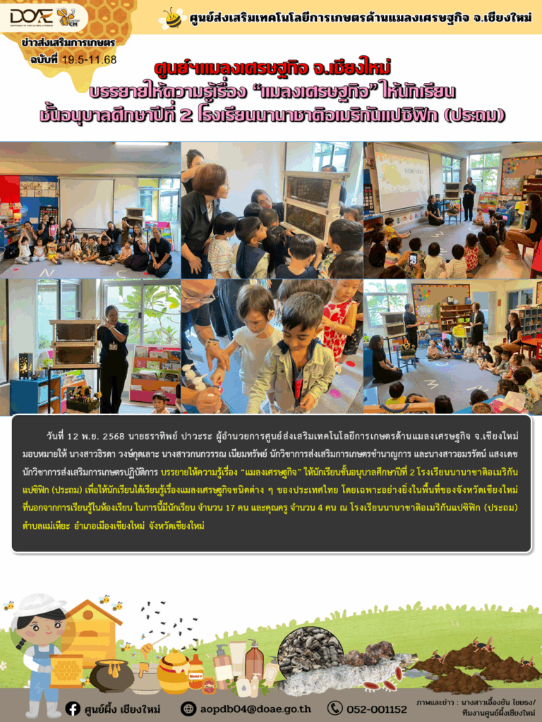 ข่าวประชาสัมพันธ์ศูนย์ฯแมลงเศรษฐกิจ จ.เชียงใหม่ บรรยายให้ความรู้เรื่อง “แมลงเศรษฐกิจ” ให้นักเรียน ชั้นอนุบาลศึกษาปีที่ 2 โรงเรียนนานาชาติอเมริกันแปซิฟิก (ประถม) aopdb04 / 12 พฤศจิกายน 2025 วันที่ 12 พ.ย. 2568