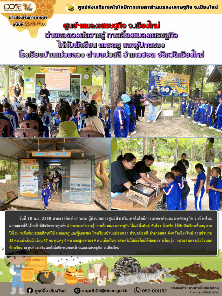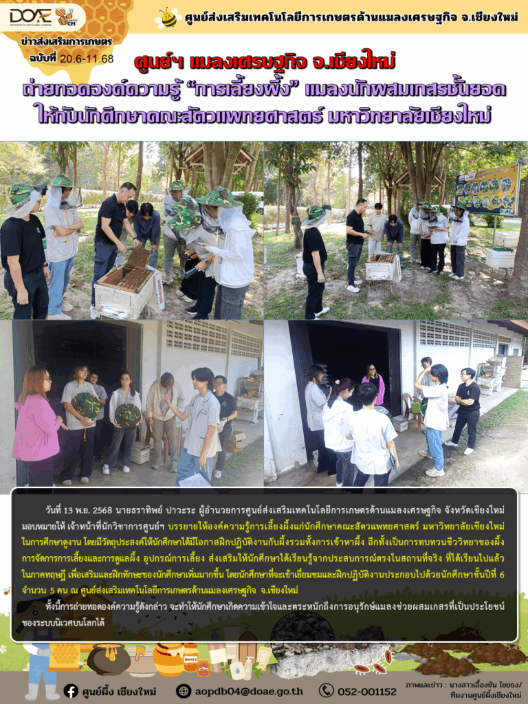 ข่าวประชาสัมพันธ์ศูนย์ฯ แมลงเศรษฐกิจ จ.เชียงใหม่ถ่ายทอดองค์ความรู้ “การเลี้ยงผึ้ง” แมลงนักผสมเกสรชั้นยอด ให้กับนักศึกษาคณะสัตวแพทยศาสตร์ มหาวิทยาลัยเชียงใหม่ aopdb04 / 13 พฤศจิกายน 2025 วันที่ 13 พ.ย. 2568