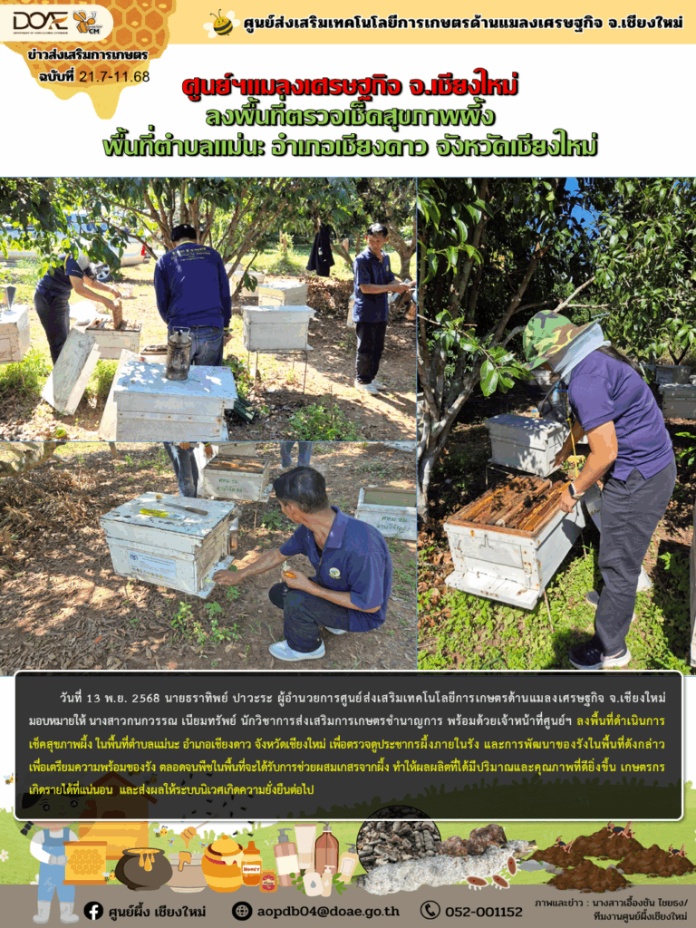 ข่าวประชาสัมพันธ์ศูนย์ฯแมลงเศรษฐกิจ จ.เชียงใหม่ ลงพื้นที่ตรวจเช็คสุขภาพผึ้ง พื้นที่ตำบลแม่นะ อำเภอเชียงดาว จังหวัดเชียงใหม่ aopdb04 / 13 พฤศจิกายน 2025 วันที่ 13 พ