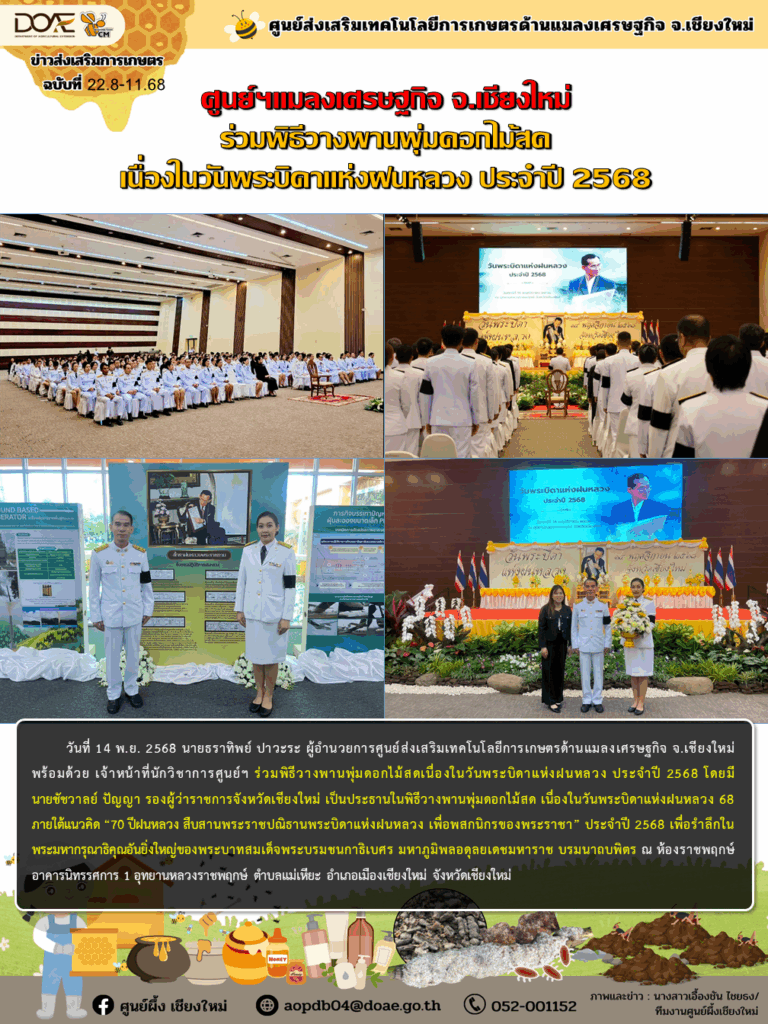 ข่าวประชาสัมพันธ์ศูนย์ฯแมลงเศรษฐกิจ จ.เชียงใหม่ ร่วมพิธีวางพานพุ่มดอกไม้สด เนื่องในวันพระบิดาแห่งฝนหลวง ประจำปี 2568 aopdb04 / 14 พฤศจิกายน 2025 วันที่ 14 พ.ย. 2568