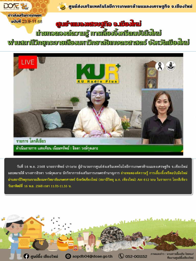 ข่าวประชาสัมพันธ์ศูนย์ฯแมลงเศรษฐกิจ จ.เชียงใหม่ ถ่ายทอดองค์ความรู้ การเลี้ยงจิ้งหรีดฉบับมือใหม่ ผ่านสถานีวิทยุกระจายเสียงมหาวิทยาลัยเกษตรศาสตร์ จังหวัดเชียงใหม่ aopdb04 / 17 พฤศจิกายน 2025 วันที่ 16 พ.ย. 2568