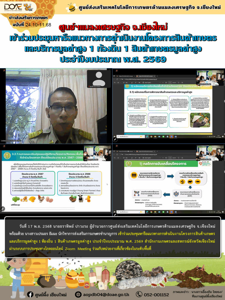 ข่าวประชาสัมพันธ์ศูนย์ฯแมลงเศรษฐกิจ จ.เชียงใหม่ เข้าร่วมประชุมหารือแนวทางการดำเนินงานโครงการสินค้าเกษตรและบริการมูลค่าสูง 1 ท้องถิ่น 1 สินค้าเกษตรมูลค่าสูง ประจำปีงบประมาณ พ.ศ. 2569 aopdb04 / 17 พฤศจิกายน 2025 วันที่ 17 พ.ย. 2568
