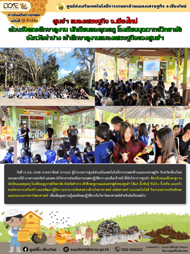 ข่าวประชาสัมพันธ์ศูนย์ฯ แมลงเศรษฐกิจ จ.เชียงใหม่ ต้อนรับคณะศึกษาดูงาน นักเรียนและคุณครู โรงเรียนบุญวาทย์วิทยาลัย จังหวัดลำปาง เข้าศึกษาดูงานแมลงเศรษฐกิจของศูนย์ฯ aopdb04 / 18 ธันวาคม 2025 วันที่ 15 ธ.ค. 2568