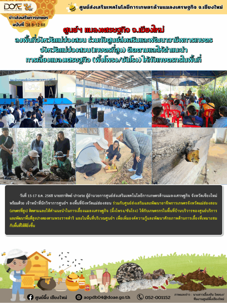 ข่าวประชาสัมพันธ์ศูนย์ฯ แมลงเศรษฐกิจ จ.เชียงใหม่ ลงพื้นที่จังหวัดแม่ฮ่องสอน ร่วมกับศูนย์ส่งเสริมและพัฒนาอาชีพการเกษตรจังหวัดแม่ฮ่องสอน(เกษตรที่สูง) ติดตามและให้คำแนะนำการเลี้ยงแมลงเศรษฐกิจ (ผึ้งโพรง/ชันโรง) ให้กับเกษตรกรในพื้นที่ aopdb04 / 18 ธันวาคม 2025 วันที่ 15-17 ธ.ค. 25