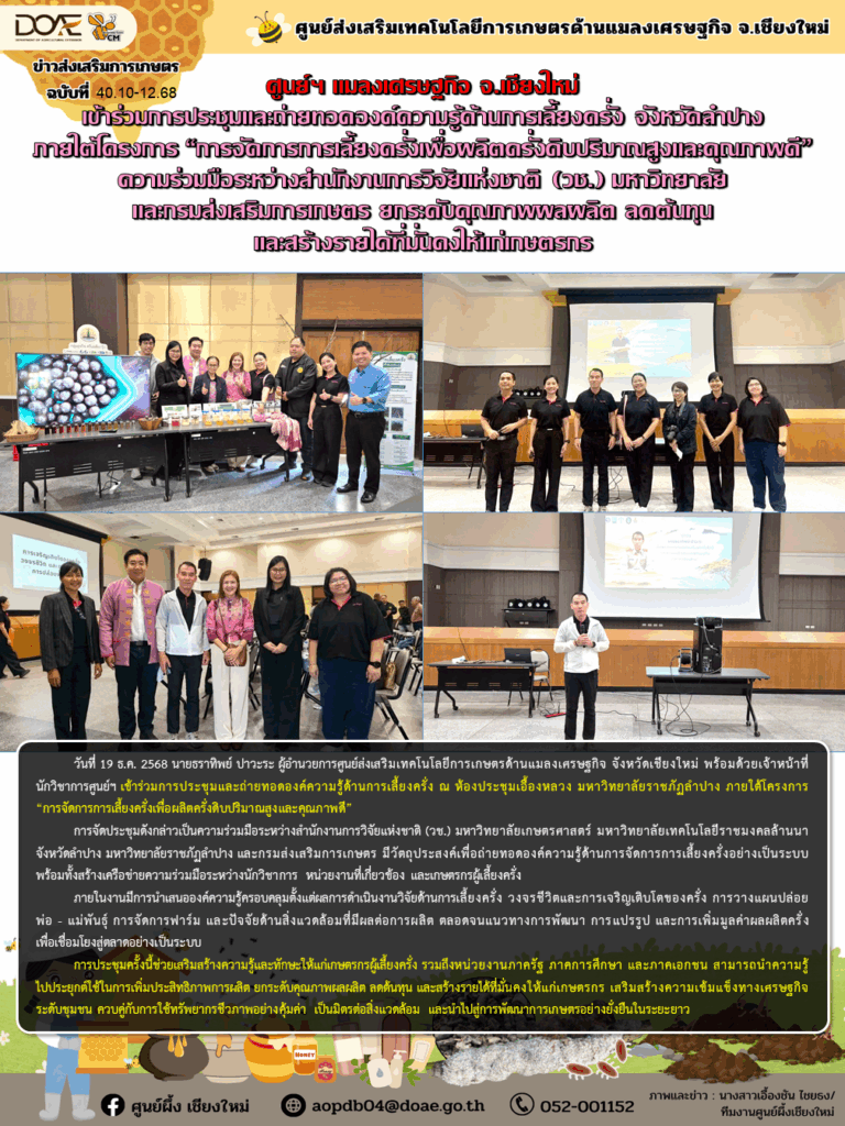 ข่าวประชาสัมพันธ์ศูนย์ฯ แมลงเศรษฐกิจ จ.เชียงใหม่ เข้าร่วมการประชุมและถ่ายทอดองค์ความรู้ด้านการเลี้ยงครั่ง จังหวัดลำปาง ภายใต้โครงการ “การจัดการการเลี้ยงครั่งเพื่อผลิตครั่งดิบปริมาณสูงและคุณภาพดี” ความร่วมมือระหว่างสำนักงานการวิจัยแห่งชาติ (วช.) มหาวิทยาลัย และกรมส่งเสริมการเกษตร ยกระดับคุณภาพผลผลิต ลดต้นทุน และสร้างรายได้ที่มั่นคงให้แก่เกษตรกร aopdb04 / 24 ธันวาคม 2025 วันที่ 19 ธ.ค. 2568