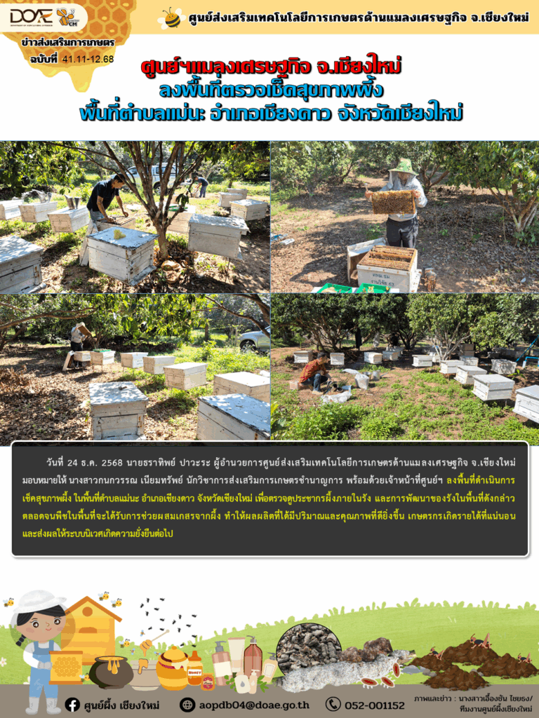 ข่าวประชาสัมพันธ์ศูนย์ฯแมลงเศรษฐกิจ จ.เชียงใหม่ ลงพื้นที่ตรวจเช็คสุขภาพผึ้ง พื้นที่ตำบลแม่นะ อำเภอเชียงดาว จังหวัดเชียงใหม่ aopdb04 / 24 ธันวาคม 2025 วันที่ 24 ธ.ค. 2568