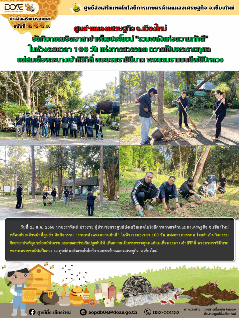 ข่าวประชาสัมพันธ์ศูนย์ฯแมลงเศรษฐกิจ จ.เชียงใหม่ จัดกิจกรรมจิตอาสาบำเพ็ญประโยชน์ “รวมพลังแห่งความภักดี” ในห้วงระยะเวลา 100 วัน แห่งการสวรรคต ถวายเป็นพระราชกุศลแด่สมเด็จพระนางเจ้าสิริกิติ์ พระบรมราชินีนาถ พระบรมราชชนนีพันปีหลวง aopdb04 / 25 ธันวาคม 2025 วันที่ 25 ธ.ค. 2568