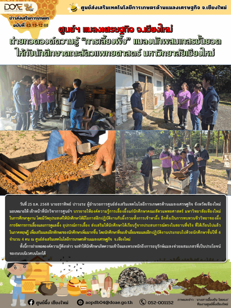 ข่าวประชาสัมพันธ์ศูนย์ฯ แมลงเศรษฐกิจ จ.เชียงใหม่ ถ่ายทอดองค์ความรู้ “การเลี้ยงผึ้ง” แมลงนักผสมเกสรชั้นยอด ให้กับนักศึกษาคณะสัตวแพทยศาสตร์ มหาวิทยาลัยเชียงใหม่ aopdb04 / 25 ธันวาคม 2025 วันที่ 25 ธ.ค. 2568