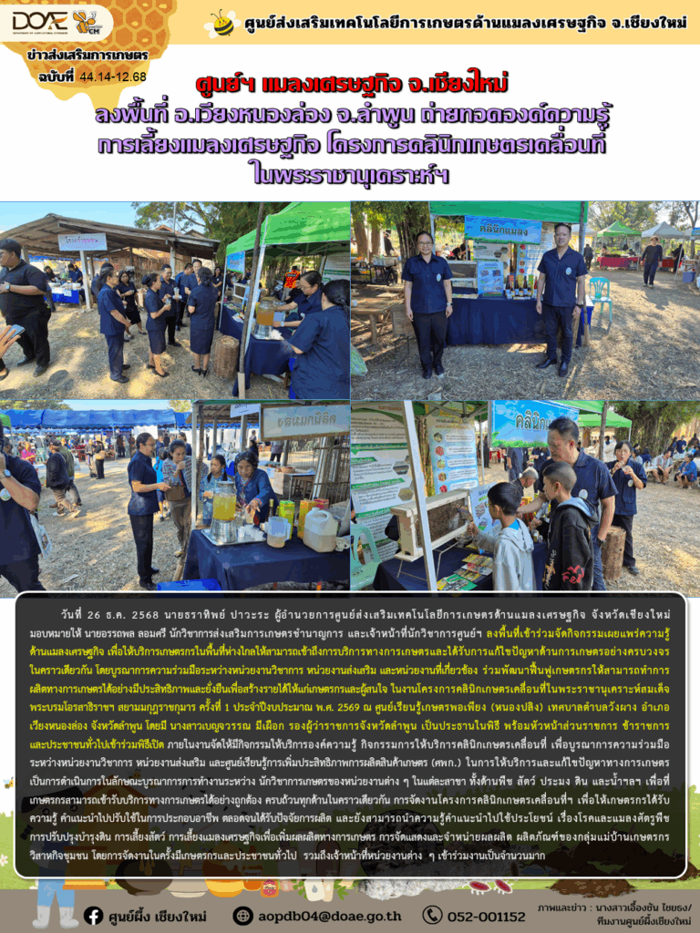 ข่าวประชาสัมพันธ์ศูนย์ฯ แมลงเศรษฐกิจ จ.เชียงใหม่ ลงพื้นที่ อ.เวียงหนองล่อง จ.ลำพูน ถ่ายทอดองค์ความรู้ การเลี้ยงแมลงเศรษฐกิจ โครงการคลินิกเกษตรเคลื่อนที่ในพระราชานุเคราะห์ฯ aopdb04 / 26 ธันวาคม 2025 วันที่ 26 ธ.ค. 2568