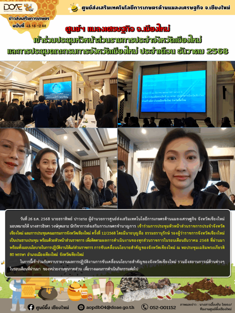 ข่าวประชาสัมพันธ์ศูนย์ฯ แมลงเศรษฐกิจ จ.เชียงใหม่ เข้าร่วมประชุมหัวหน้าส่วนราชการประจำจังหวัดเชียงใหม่ และการประชุมคณะกรมการจังหวัดเชียงใหม่ ประจำเดือน ธันวาคม 2568 aopdb04 / 26 ธันวาคม 2025 วันที่ 26 ธ.ค. 2568 […]