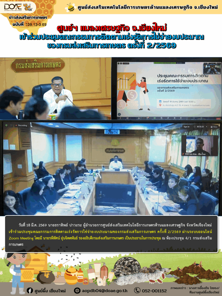 ข่าวประชาสัมพันธ์ศูนย์ฯแมลงเศรษฐกิจ จ.เชียงใหม่ เข้าร่วมประชุมคณะกรรมการติดตามเร่งรัดการใช่จ่ายงบประมาณของกรมส่งเสริมการเกษตร ครั้งที่ 2/2569 aopdb04 / 23 มีนาคม 2026 วันที่ 18 มี.ค. 2569