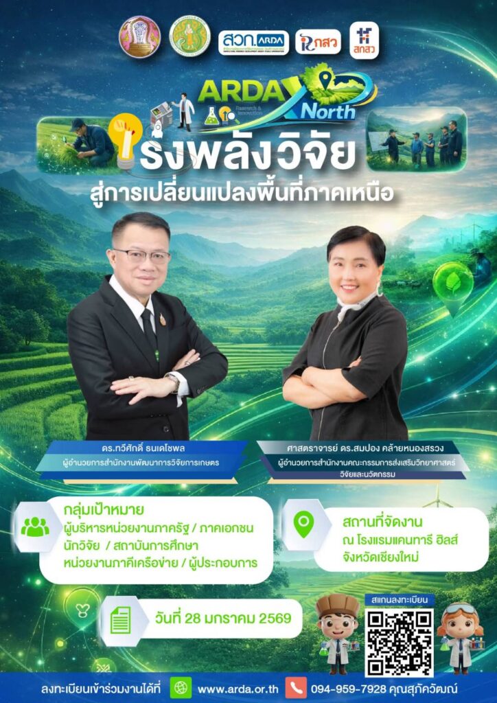 วันที่ 28 มกราคม 2569 นายสมชาย กันธะวงค์ ผู้อำนวยการศูนย์ส่งเสริมและพัฒนาอาชีพการเกษตรจังหวัดเชียงใหม่ มอบหมายให้ นายนเรศ แก้วปินตา นักวิชาการส่งเสริมการเกษตรชำนาญการ เข้าร่วมเป็นเกียรติพิธีเปิดงาน ARDA x North : Accelerating Research Lmpact in Northen Thailand เร่งพลังวิจัย สู่การเปลี่ยนแปลงพื้นที่ภาคเหนือ ณ โรงแรมแคนทารี่ฮิลล์ อำเภอเมืองเชียงใหม่ จังหวัดเชียงใหม่