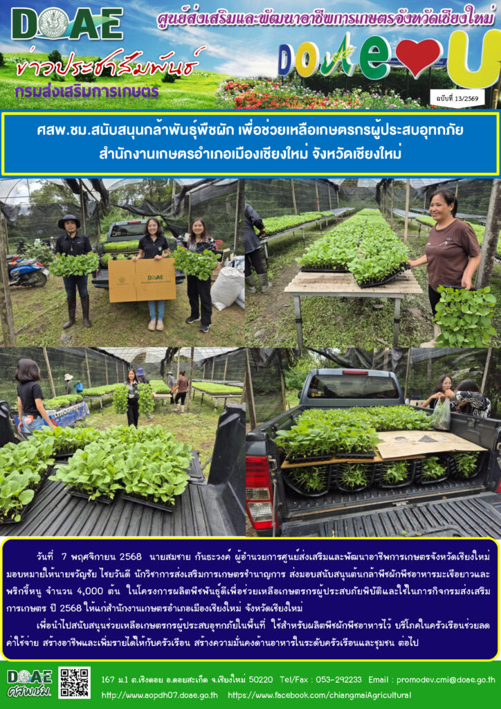ข่าวประชาสัมพันธ์ศสพ.ชม.สนับสนุนกล้าพันธุ์พืชผัก เพื่อช่วยเหลือเกษตรกรผู้ประสบอุทกภัย สำนักงานเกษตรอำเภอเมืองเชียงใหม่ จังหวัดเชียงใหม่ aopdh07 / 11 พฤศจิกายน 2025 วันที่ 7 พฤศจิ […]