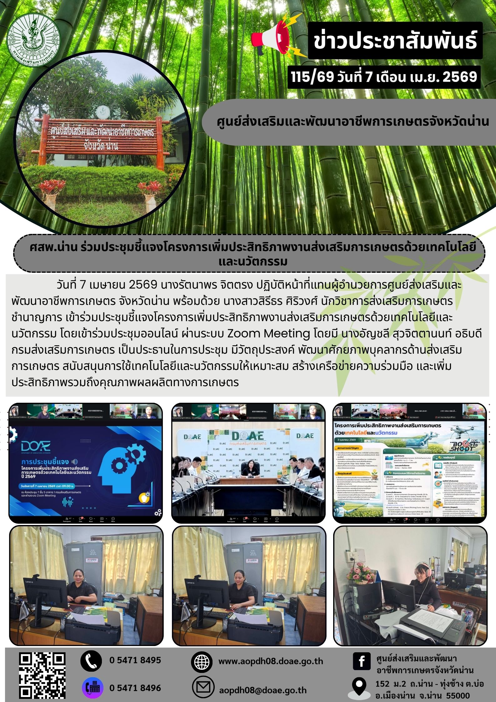 ศสพ.น่าน ร่วมประชุมชี้แจงโครงการเพิ่มประสิทธิภาพงานส่งเสริมการเกษตรด้วยเทคโนโลยีและนวัตกรรม