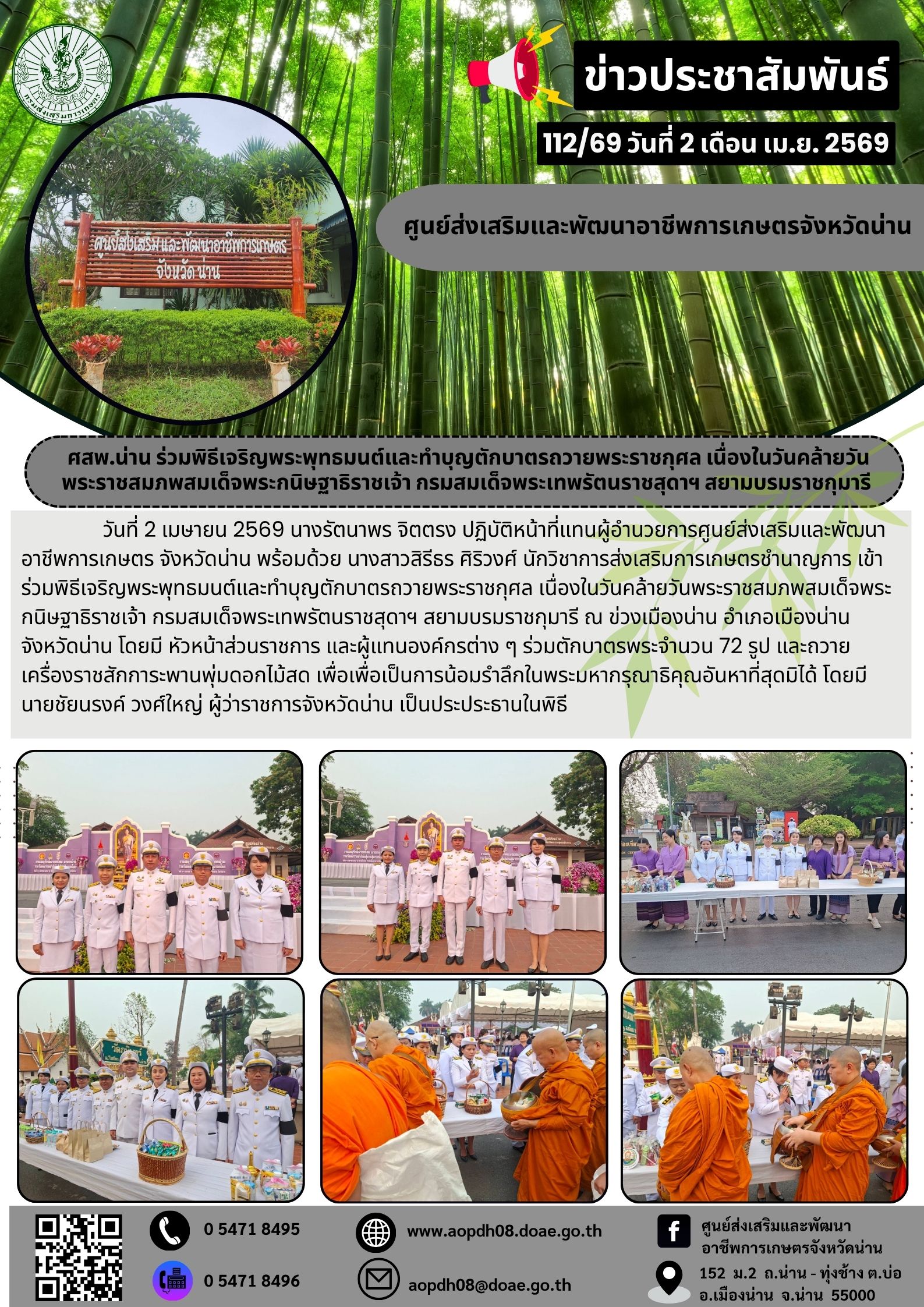 ศสพ.น่าน ร่วมพิธีเจริญพระพุทธมนต์และทําบุญตักบาตรถวายพระราชกุศล เนื่องในวันคล้ายวันพระราชสมภพสมเด็จพระกนิษฐาธิราชเจ้า กรมสมเด็จพระเทพรัตนราชสุดาฯ สยามบรมราชกุมารี