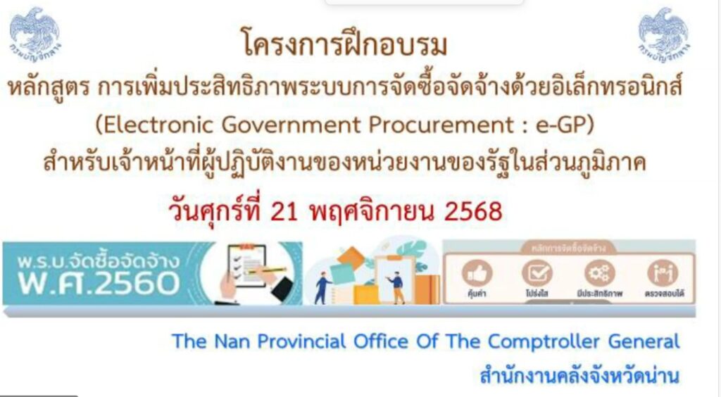 วันที่ 21 พฤศจิกายน 2568 นางรัตนาพร จิตตรง ปฏิบัติหน้าที่แทนผู้อำนวยการศูนย์ส่งเสริมและพัฒนาอาชีพการเกษตร จังหวัดน่าน มอบหมายให้ เจ้าหน้าที่ ศสพ.น่าน เข้าร่วมโครงการฝึกอบรมมแบบออนไลน์ หลักสูตร การเพิ่มประสิทธิิภาพการจัดซื้อจัดจ้างด้วยวิธีการทางอิลิกทรอนิกส์ (Electronic Government Procurement : e-GP) สำหรับเจ้าหน้าที่ผู้ปฏิบัติงานของหน่วยงานของรัฐในส่วนภูมิภาค ผ่านระบบออนไลน์ ด้วยโปรแกรม Microsoft Teams เพื่อให้ผู้ปฏิบัติหรือเจ้าหน้าที่ที่เกี่ยวข้องมีความรู้ ความเข้าใจ และสามารถใช้เป็นแนวทางในการปฏิบัติอย่างถูกต้องมีประสิทธิภาพ และเกิดประสิทธิผล