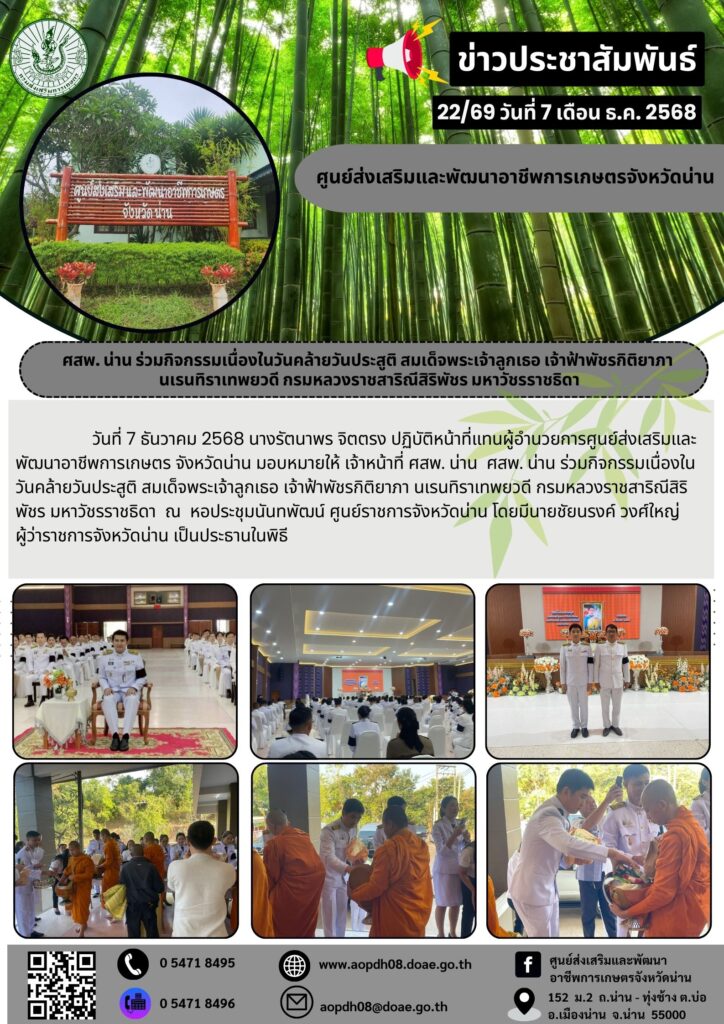 นางรัตนาพร จิตตรง ปฏิบัติหน้าที่แทนผู้อำนวยการศูนย์ส่งเสริมและพัฒนาอาชีพการเกษตร จังหวัดน่าน มอบหมายให้เจ้าหน้าที่ ศสพ. น่าน ร่วมกิจกรรม เนื่องในวันคล้ายวันประสูติ สมเด็จพระเจ้าลูกเธอ เจ้าฟ้าพัชรกิติยาภา นเรนทิราเทพยวดี กรมหลวงราชสาริณีสิริพัชร มหาวัชรราชธิดา ณ หอประชุมนันทพัฒน์ ศูนย์ราชการจังหวัดน่าน