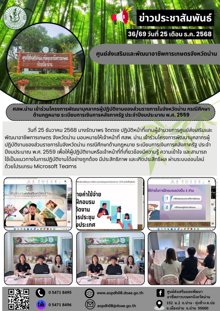 นางรัตนาพร จิตตรง ปฏิบัติหน้าที่แทนผู้อำนวยการศูนย์ส่งเสริมและพัฒนาอาชีพการเกษตร จังหวัดน่าน มอบหมายให้เจ้าหน้าที่ ศสพ. น่าน เข้าร่วม โครงการพัฒนาบุคลากรผู้ปฏิบัติงานของส่วนราชการในจังหวัดน่าน 💼✨