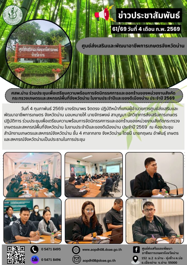 การประชุมดังกล่าวจัดขึ้นเพื่อเตรียมการเข้าร่วม งานประจำปีและของดีเมืองน่าน ประจำปี 2569 ณ ห้องประชุมสำนักงานเกษตรและสหกรณ์จังหวัดน่าน ชั้น 4 ศาลากลางจังหวัดน่าน โดยมี นายกฤษณ อำพันธุ์ เกษตรและสหกรณ์จังหวัดน่าน เป็นประธานในการประชุม