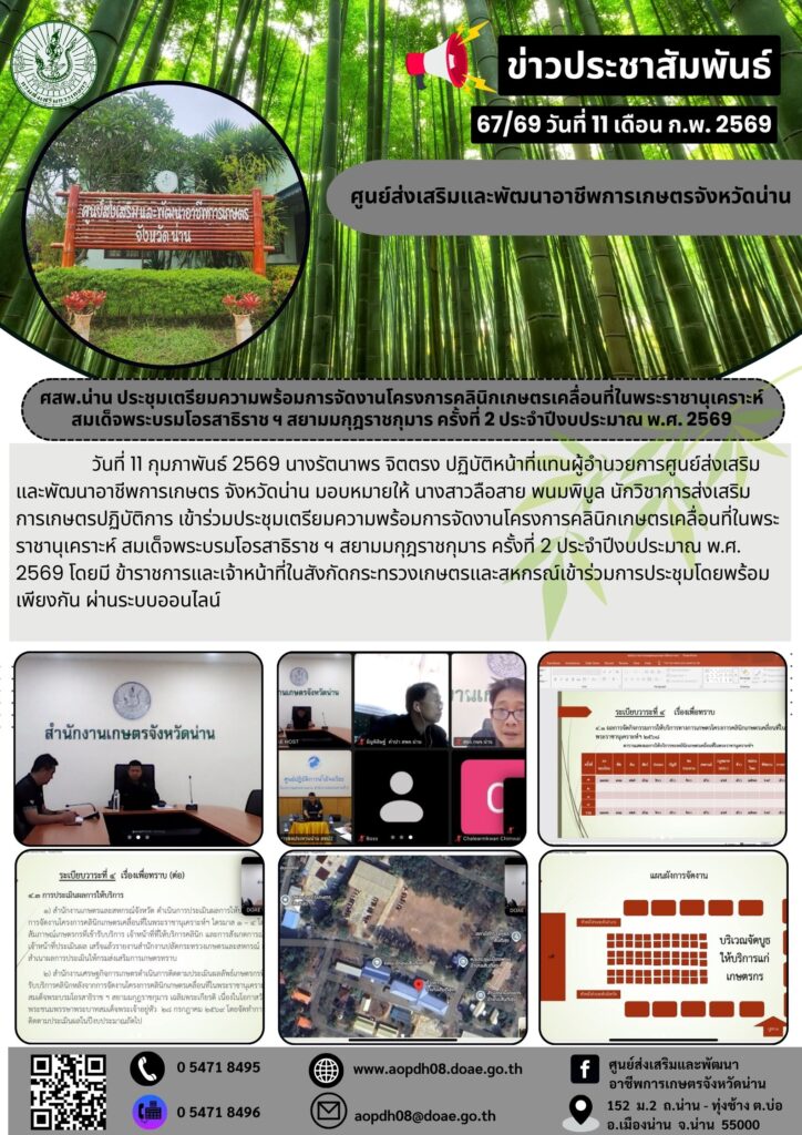 ศสพ.น่าน ประชุมเตรียมความพร้อมการจัดงานโครงการคลินิกเกษตรเคลื่อนที่ในพระราชานุเคราะห์ สมเด็จพระบรมโอรสาธิราช ฯ สยามมกุฎราชกุมาร ครั้งที่ 2 ประจำปีงบประมาณ พ.ศ. 2569By aopdh08 / 12 กุมภาพันธ์ 2026