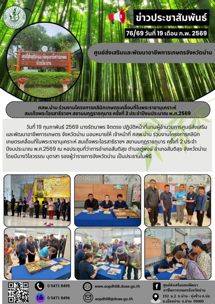 วันที่ 19 กุมภาพันธ์ 2569 นางรัตนาพร จิตตรง ปฏิบัติหน้าที่แทนผู้อำนวยการศูนย์ส่งเสริมและพัฒนาอาชีพการเกษตร จังหวัดน่าน มอบหมายให้เจ้าหน้าที่ ศสพ.น่าน เข้าร่วมงานโครงการคลินิกเกษตรเคลื่อนที่ในพระราชานุเคราะห์ สมเด็จพระโอรสาธิราชฯ สยามมกุฎราชกุมาร ครั้งที่ 2 ประจำปีงบประมาณ พ.ศ. 2569