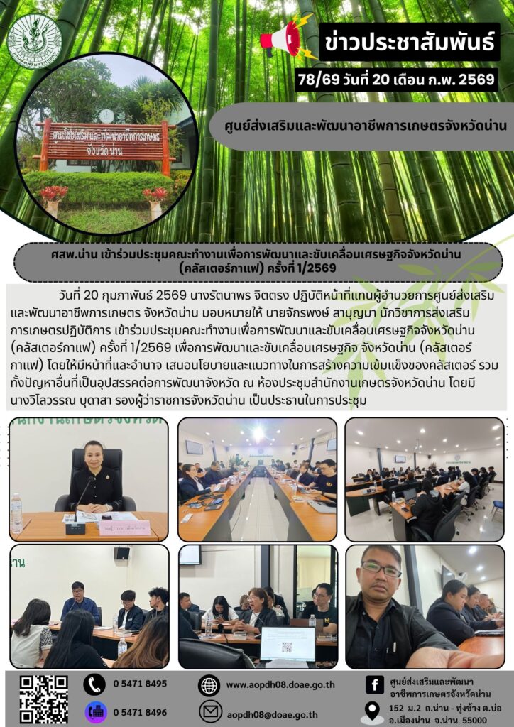 วันที่ 20 กุมภาพันธ์ 2569 นางรัตนาพร จิตตรง ปฏิบัติหน้าที่แทนผู้อำนวยการศูนย์ส่งเสริมและพัฒนาอาชีพการเกษตร จังหวัดน่าน มอบหมายให้ นายจักรพงษ์ สาบุญมา นักวิชาการส่งเสริมการเกษตรปฏิบัติการ เข้าร่วมประชุมคณะทำงานเพื่อการพัฒนาและขับเคลื่อนเศรษฐกิจจังหวัดน่าน (คลัสเตอร์กาแฟ) ครั้งที่ 1/2569 ![]()