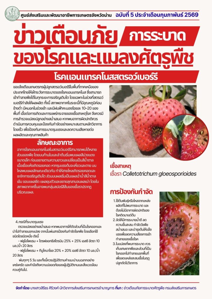 ขอให้เกษตรกรในพื้นที่ภาคเหนือของประเทศไทยเฝ้าระวังการระบาดของ โรคแอนแทรคโนส ซึ่งสามารถเข้าทำลายสตรอว์เบอร์รีได้ในทุกระยะการเจริญเติบโต โดยเฉพาะช่วงที่กำลังให้ผลผลิต ![]()