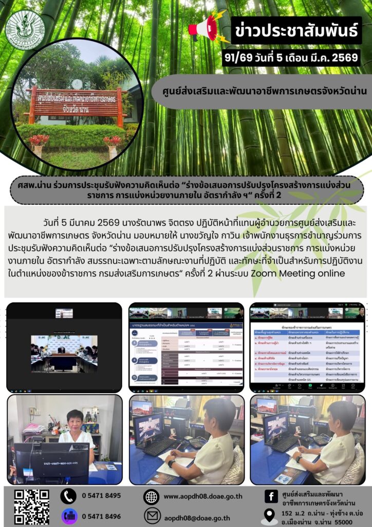 วันที่ 5 มีนาคม 2569 นางรัตนาพร จิตตรง ปฏิบัติหน้าที่แทนผู้อำนวยการศูนย์ส่งเสริมและพัฒนาอาชีพการเกษตร จังหวัดน่าน มอบหมายให้ นางขวัญใจ กาวิน เจ้าพนักงานธุรการชำนาญงาน เข้าร่วมการประชุมรับฟังความคิดเห็นต่อ “ร่างข้อเสนอการปรับปรุงโครงสร้างการแบ่งส่วนราชการ การแบ่งหน่วยงานภายใน อัตรากำลัง สมรรถนะเฉพาะตามลักษณะงานที่ปฏิบัติ และทักษะที่จำเป็นสำหรับการปฏิบัติงานในตำแหน่งของข้าราชการ กรมส่งเสริมการเกษตร” ครั้งที่ 2 ผ่านระบบ Zoom Meeting Online 💻