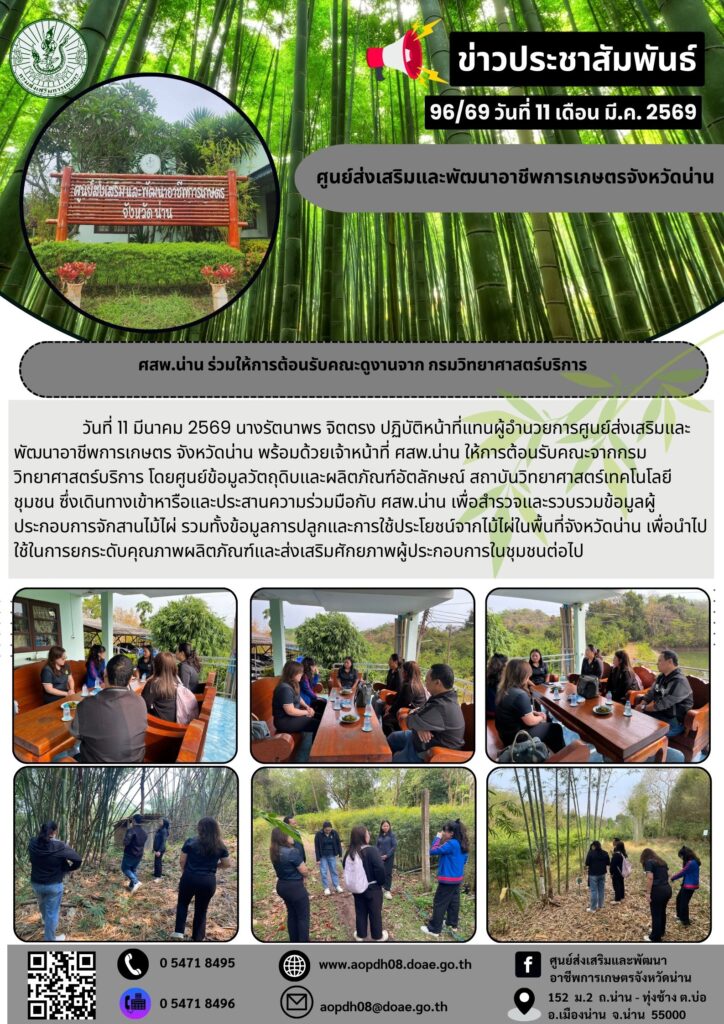 นางรัตนาพร จิตตรง ปฏิบัติหน้าที่แทนผู้อำนวยการศูนย์ส่งเสริมและพัฒนาอาชีพการเกษตร จังหวัดน่าน พร้อมด้วยเจ้าหน้าที่ ศสพ.น่าน ให้การต้อนรับคณะจาก กรมวิทยาศาสตร์บริการ โดยศูนย์ข้อมูลวัตถุดิบและผลิตภัณฑ์อัตลักษณ์ สถาบันวิทยาศาสตร์เทคโนโลยีชุมชน 🤝