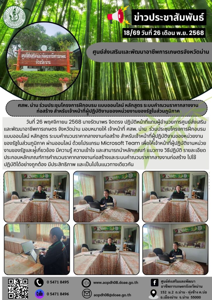 ข่าวประชาสัมพันธ์ศสพ. น่าน ร่วมประชุมโครงการฝึกอบรม แบบออนไลน์ หลักสูตร ระบบคำณวนราคากลางงานก่อสร้าง สำหรับเจ้าหน้าที่ผูู้ปฏิบัติงานของหน่วยงานของรัฐในส่วนภูมิภาค aopdh08 / 27 พฤศจิกายน 2025 ข่าวประชาสัมพันธ์ ศส