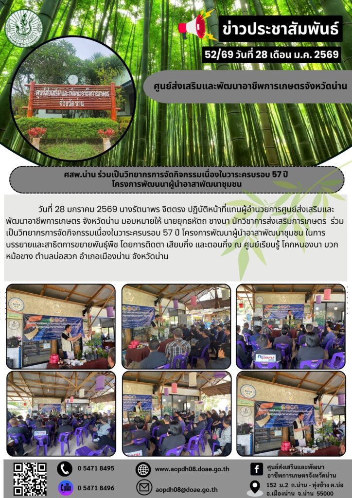 ข่าวประชาสัมพันธ์ศสพ.น่าน ร่วมเป็นวิทยากรการจัดกิจกรรมเนื่องในวาระครบรอบ 57 ปี aopdh08 / 28 มกราคม 2026 โครงการพัฒนนาผู้นำอา