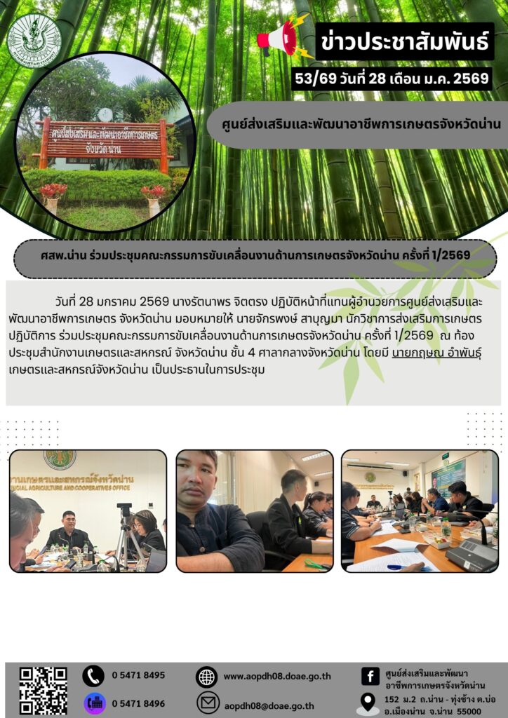 ข่าวประชาสัมพันธ์ศสพ.น่าน ร่วมประชุมคณะกรรมการขับเคลื่อนงานด้านการเกษตรจังหวัดน่าน ครั้งที่ 1/2569 aopdh08 / 28 มกราคม 2026 ข่าวประชาสัมพันธ์กิจ