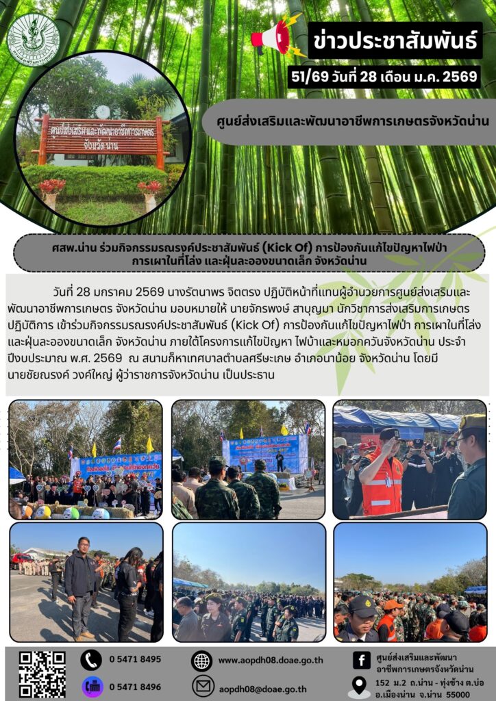 ข่าวประชาสัมพันธ์ศสพ.น่าน ร่วมกิจกรรมรณรงค์ประชาสัมพันธ์ (Kick Of) การป้องกันแก้ไขปัญหาไฟป่า aopdh08 / 28 มกราคม 2026 การเผาในที่โล่ง และฝ