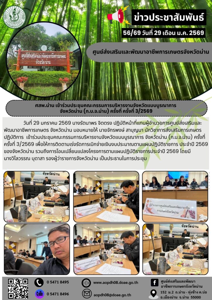 ข่าวประชาสัมพันธ์ศสพ.น่าน เข้าร่วมประชุมคณะกรรมการบริหารงานจังหวัดแบบบูรณาการ aopdh08 / 29 มกราคม 2026 จังหวัดน่าน (ก.บ.จ.น