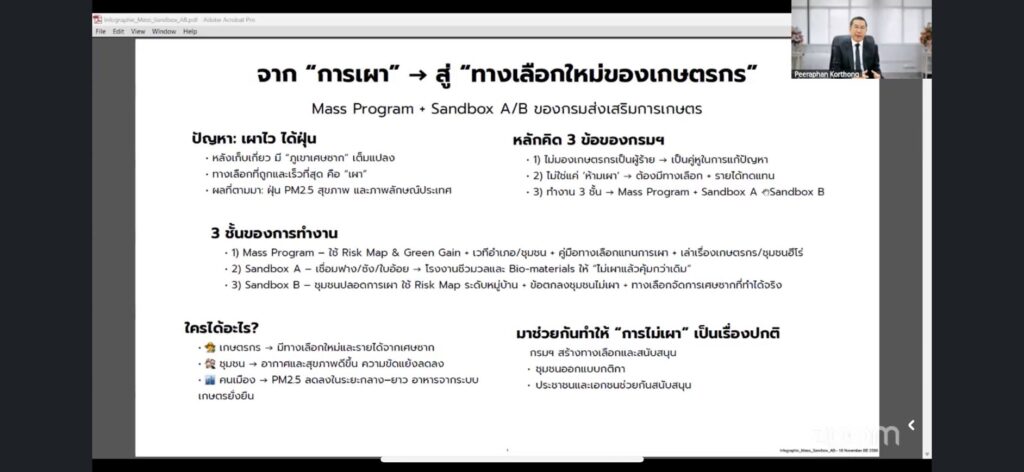 วันที่ 18 พฤศจิกายน 2568 เวลา 09.30 น. นางพรรณี สุขใส ผู้อำนวยการศูนย์ส่งเสริมและพัฒนาอาชีพการเกษตรจังหวัดเชียงราย มอบหมายให้เจ้าหน้าที่ศูนย์ฯ ร่วมรับชม Facebook Live กระทรวงเกษตรและสหกรณ์ : รายการ “อัปเดต เกษตรนำ” เรื่องสถานการณ์และการเตรียมความพร้อมรับมือปัญหาหมอกควันฝุ่นละออง PM 2.5 และมาตรการลดเผาในพื้นที่เกษตร โดยนายพีรพันธ์ คอทอง อธิบดีกรมส่งเสริมการเกษตร และนายราเชน ศิลปะรายะ อธิบดีกรมฝนหลวงและการบินเกษตร