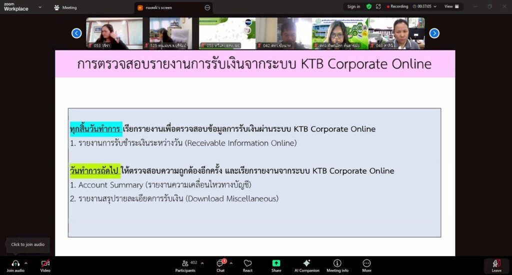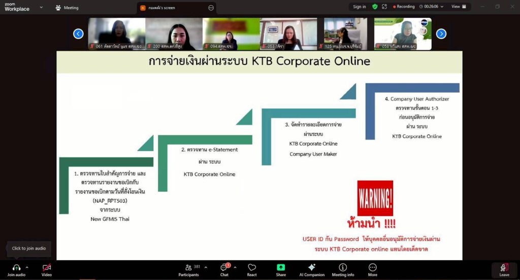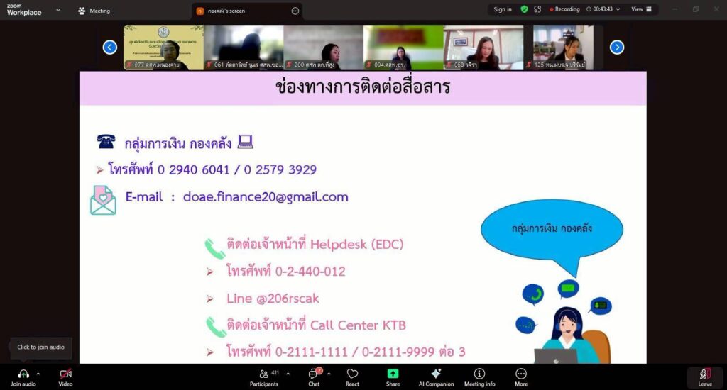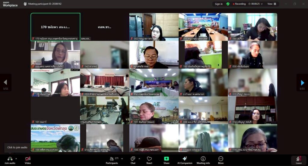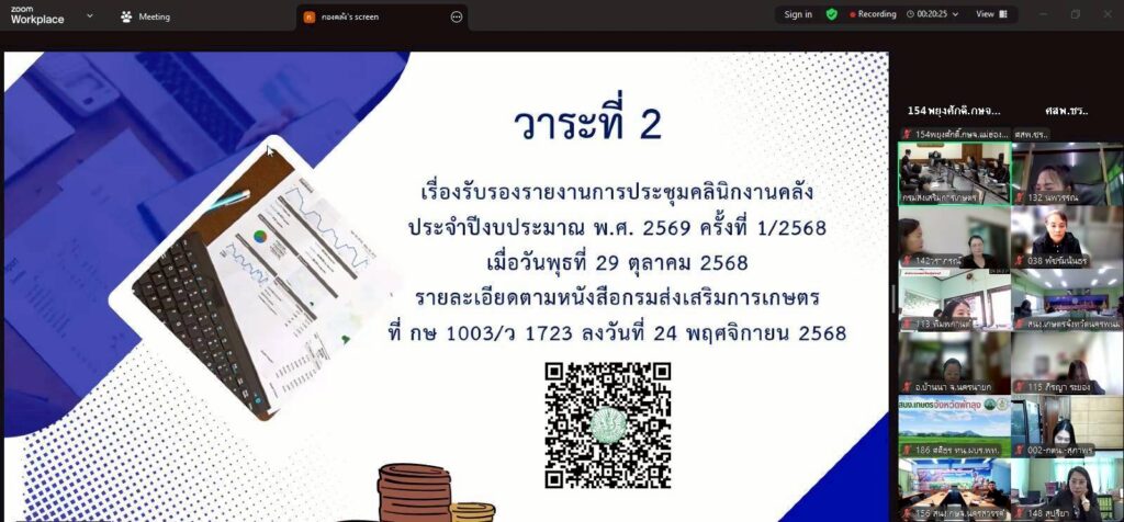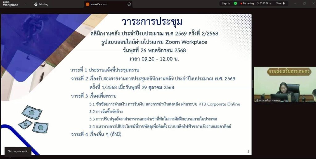 วันที่ 26 พฤศจิกายน 2568 เวลา 09.30 น. นางพรรณี สุขใส ผู้อำนวยการศูนย์ส่งเสริมและพัฒนาอาชีพการเกษตรจังหวัดเชียงราย พร้อมด้วยเจ้าหน้าที่ศูนย์ฯ เข้าร่วมประชุมคลินิกงานคลัง ประจำปีงบประมาณ พ.ศ.2569 ครั้งที่ 2/2568 ผ่านระบบออนไลน์ Zoom Meeting. จากห้องประชุมศูนย์ปฏิบัติการ กรมส่งเสริมการเกษตร ณ ศูนย์ส่งเสริมและพัฒนาอาชีพการเกษตรจังหวัดเชียงราย เพื่อให้การดำเนินงานด้านการบริหารงานคลังของหน่วยงานในสังกัดกรมส่งเสริมการเกษตรเป็นไปอย่างมีประสิทธิภาพ มีช่องทางสร้างการรับรู้ การแลกเปลี่ยนเรียนรู้ การให้คำปรึกษาและคำแนะนำในการปฏิบัติงาน รวมทั้งติดตามผลการดำเนินงานด้านการบริหารงานคลังอย่างต่อเนื่อง โดยมีนางสาวชลาลัย มัณฑปาน ผู้อำนวยการกองคลัง กรมส่งเสริมการเกษตร เป็นประธานในการประชุมฯ