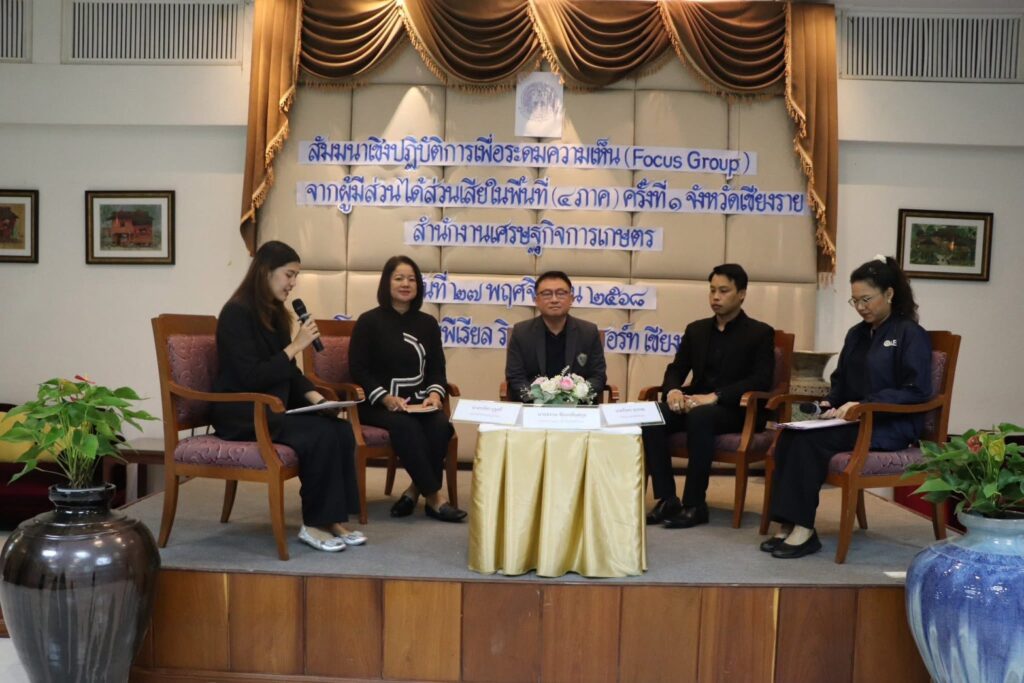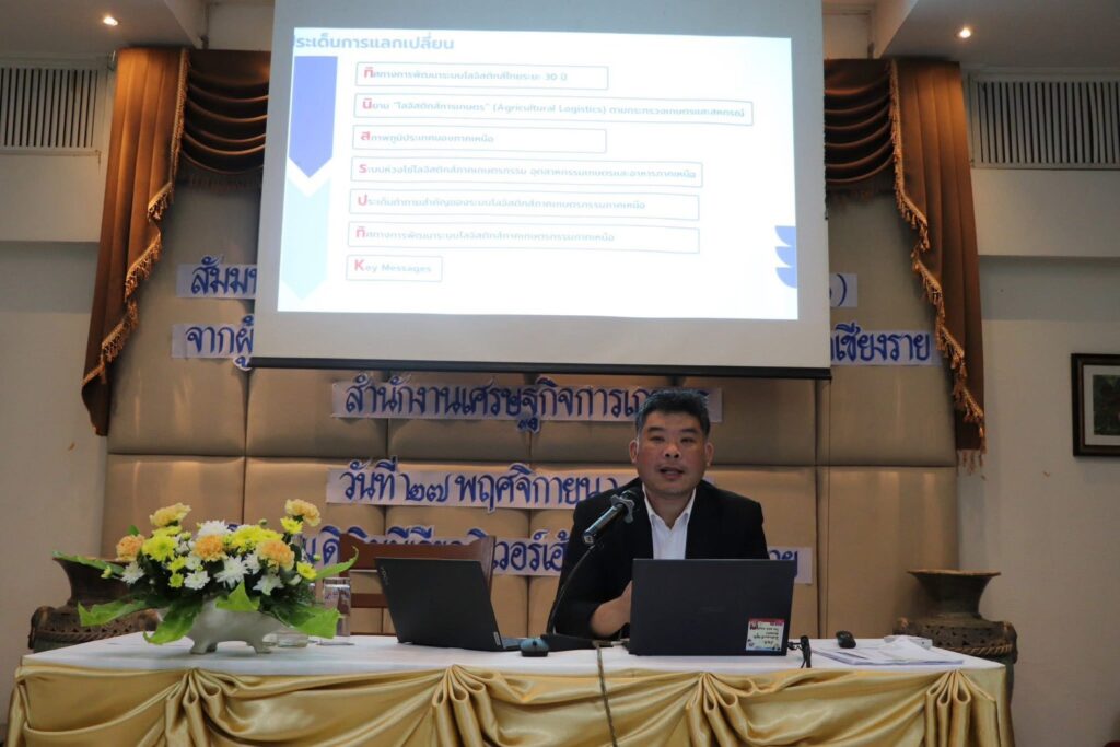 วันที่ 27 พฤศจิกายน 2568 เวลา 08.30 น. นางพรรณี สุขใส ผู้อำนวยการศูนย์ส่งเสริมและพัฒนาอาชีพการเกษตรจังหวัดเชียงราย มอบหมายให้เจ้าหน้าที่ศูนย์ฯ เข้าร่วมสัมมนาเชิงปฏิบัติการเพื่อระดมความเห็น (Focus Group) จากผู้มีส่วนได้ส่วนเสียในพื้นที่ (4 ภาค) ครั้งที่ 1 จังหวัดเชียงราย เพื่อร่วมแลกเปลี่ยนเรียนรู้และประสบการณ์ที่เกี่ยวข้องกับการพัฒนาระบบโลจิสติกส์การเกษตรภาคเหนือ ตลอดจนระดมความคิดเห็นและข้อเสนอแนะจากผู้เข้าร่วมการสัมมนา สำหรับใช้เป็นข้อมูลประกอบการจัดทำแผนปฏิบัติการด้านการพัฒนาระบบโลจิสติกส์ภาคการเกษตรในพื้นที่และภาพรวามของประเทศ ซึ่งผู้เข้าร่วมสัมมนาเชิงปฏิบัติการฯ ประกอบด้วย บุคลากรหน่วยงานภาครัฐ และภาคเอกชน โดยมีนายวินิต อธิสุข รองเลขาธิการสำนักงานเศรษฐกิจการเกษตร เป็นประธานกล่าวเปิดการสัมมนาฯ เชิงปฏิบัติการเพื่อระดมความเห็น (Focus Group) จากผู้มีส่วนได้ส่วนเสียในพื้นที่(4 ภาค) ครั้งที่ 1 จังหวัดเชียงราย โดยมีนางสาวศิริรัตน์ ตั้งเจริญกิจกุล ผู้อำนวยการส่วนนโยบายและแผนพัฒนาระบบโลจิสติกส์ด้านการเกษตร กองนโยบายและแผนพัฒนาการเกษตร เป็นผู้กล่าวรายงานและวัตถุประสงค์ของการจัดสัมมนาฯ ณ โรงแรม ดิ อิมพิเรียล ริเวอร์เฮาส์ รีสอร์ท เชียงราย