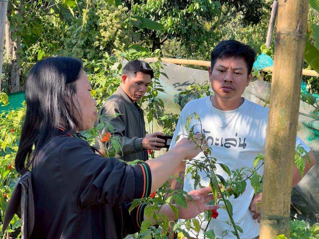 วันที่ 3 ธันวาคม 2568 นางพรรณี สุขใส ผู้อำนวยการศูนย์ส่งเสริมและพัฒนาอาชีพการเกษตรจังหวัดเชียงราย มอบหมายให้เจ้าหน้าที่ศูนย์ฯ ลงพื้นที่ร่วมกับเจ้าหน้าที่จากสำนักงานเกษตรอำเภอแม่ลาวให้คำปรึกษากับเกษตรกรผู้ปลูกพริก แคโรไลนา รีปเปอร์ และพริก Ghost Peppe ที่พบปัญหาใบเหลือ และร่วงหล่น เบื้องต้นให้คำแนะนำตัดต้นที่แสดงอาการไวรัสทิ้ง พ่นสารเคมีป้องกันกำจัดแมลงที่เป็นพาหะไวรัส และบำรุงต้นให้แข็งแรง แนะนำให้คลุมฟางว้นระยะห่างจากโคนต้น ใช้ปุ๋ยหมักช่่วยในการปรับปรุงดิน ณ ตำบลบัวสลี อำเภอแม่ลาว จังหวัดเชียงราย