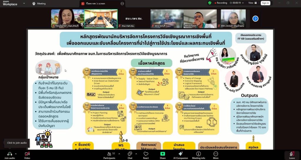 วันที่ 4 มีนาคม 2569 เวลา 13.30 น. นางพรรณี สุขใส ผู้อำนวยการศูนย์ส่งเสริมและพัฒนาอาชีพการเกษตรจังหวัดเชียงราย พร้อมด้วยเจ้าหน้าที่ศูนย์ฯ เข้าร่วมรับฟังแนวทางการสมัครเข้ารับการพัฒนาศักยภาพเจ้าหน้าที่หลักสูตรพัฒนานักบริหารจัดการโครงการวิจัยเชิงบูรณาการเชิงพื้นที่ ผ่านระบบออนไลน์ Zoom Meeting. ณ ศูนย์ส่งเสริมและพัฒนาอาชีพการเกษตรจังหวัดเชียงราย เพื่อสร้างการรับรู้การออกแบบและขับเคลื่อนโครงการที่นำไปสู่การใช้ประโยชน์และผลกระทบเชิงพื้นที่ ภายใต้โครงการ การพัฒนาระบบการบริหารจัดการโครงการวิจัยเชิงบูรณาการของพื้นที่ในการส่งเสริมและถ่ายทอดเทคโนโลยีที่เหมาะสมสู่การใช้ประโยชน์